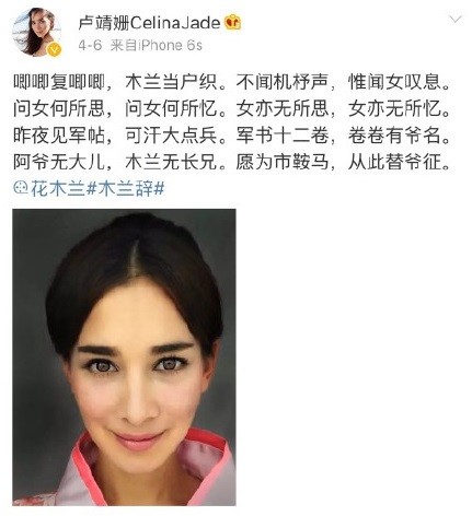 近日,中美混血女演員、《戰狼2》女主演盧靖姍在微博中發布了一張疑似迪士尼真人版《花木蘭》(趙薇版 動畫版)的定妝照,并以《木蘭辭》配文,網友紛紛猜測,該片花木蘭角色人選或已花落盧靖姍。